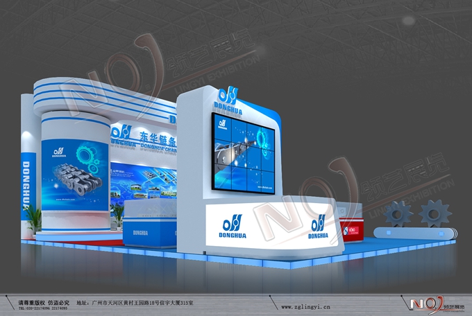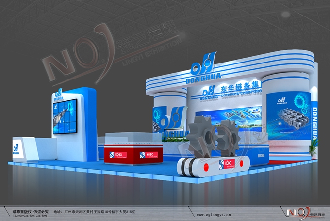 契合東華鏈條的品牌形象和產(chǎn)品特性,采用矩形結(jié)構(gòu),再搭配燈具燈光的效果,襯托出展位高端、時(shí)尚的氛圍,突出一種現(xiàn)代、大氣的時(shí)尚品味。