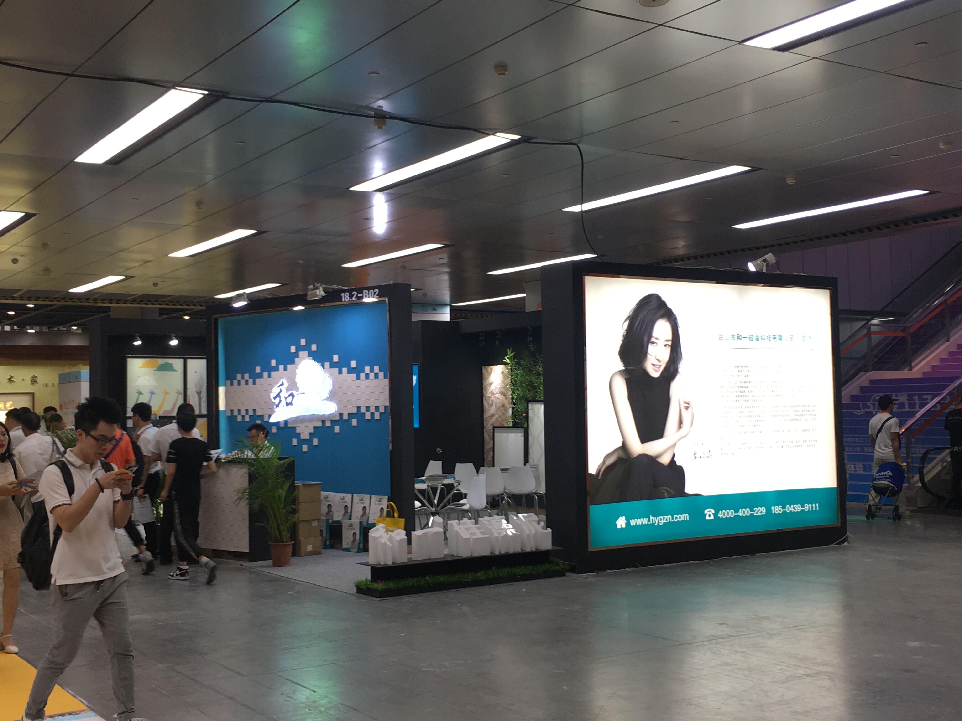 契合和一硅藻泥的品牌形象和產(chǎn)品特性,利用黑色突出產(chǎn)品,再搭配燈具燈光的效果,襯托出展位現(xiàn)代、突出一種現(xiàn)代、高端的時尚品味。