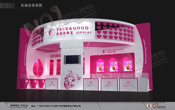 契合真誠美珠寶的品牌形象和產(chǎn)品特性,以弧形結(jié)構(gòu)為主造型,再搭配燈具燈光的效果,襯托出展位絢麗、商務的氛圍,突出一種典雅、尊貴的時尚品味