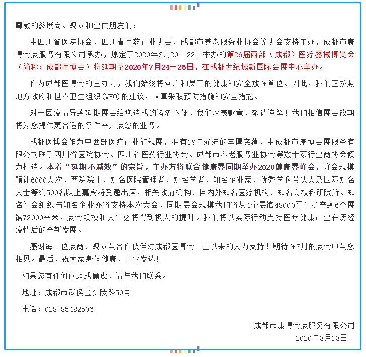 根據(jù)醫(yī)博會設計搭建公司領藝展覽了解到,原定于2020年3月20—22日舉辦的第26屆西部(成都)醫(yī)療器械博覽會(簡稱:成都醫(yī)博會)將延期至2020年7月24—26日,在成都世紀城新國際會展中心舉辦。如需醫(yī)博會展會設計請聯(lián)系領藝展覽,希望我們能在醫(yī)博會搭建上為您添磚加瓦,祝各位朋友收獲多多,滿載而歸!