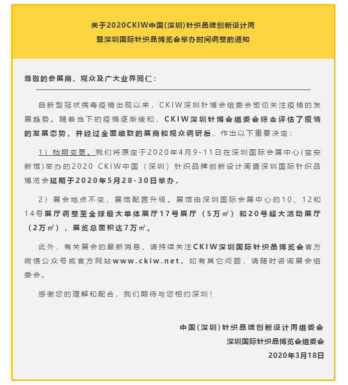 根據(jù)針博會設(shè)計搭建公司領(lǐng)藝展覽了解到,原定于2020年4月9-11日在深圳國際會展中心(寶安新館)舉辦的2020 CKIW中國(深圳)針織品牌創(chuàng)新設(shè)計周暨深圳國際針織品博覽會延期于2020年5月28-30日舉辦。如需針博會展會設(shè)計請聯(lián)系領(lǐng)藝展覽,希望我們能在針博會搭建上為您添磚加瓦,祝各位朋友收獲多多,滿載而歸!