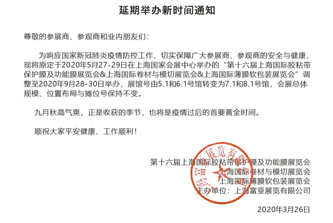 根根據(jù)薄膜展設(shè)計(jì)搭建公司領(lǐng)藝展覽了解到,原定于2020年5月27-29日在上海國(guó)家會(huì)展中心舉辦的“第十六屆上海國(guó)際膠粘帶保護(hù)膜及功能膜展覽會(huì)&上海國(guó)際卷材與模切展覽會(huì)&上海國(guó)際薄膜軟包裝展覽會(huì)”調(diào)整至2020年9月28-30日舉辦,展館號(hào)由5.1和6.1號(hào)館轉(zhuǎn)變?yōu)?.1和8.1號(hào)館,會(huì)展總體規(guī)模、位置布局與攤位號(hào)保持不變。如需薄膜展設(shè)計(jì)請(qǐng)聯(lián)系領(lǐng)藝展覽,希望我們能在薄膜展搭建上為您添磚加瓦,祝各位朋友收獲多多,滿載而歸!