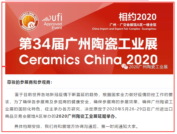 根據(jù)陶瓷展設(shè)計搭建公司領(lǐng)藝展覽了解到,原定于2020年5月26-29日在廣州進出口商品交易會展館A區(qū)舉辦的2020廣州陶瓷工業(yè)展延期舉辦。如需陶瓷展設(shè)計請聯(lián)系領(lǐng)藝展覽,希望我們能在陶瓷展搭建上為您添磚加瓦,祝各位朋友收獲多多,滿載而歸!