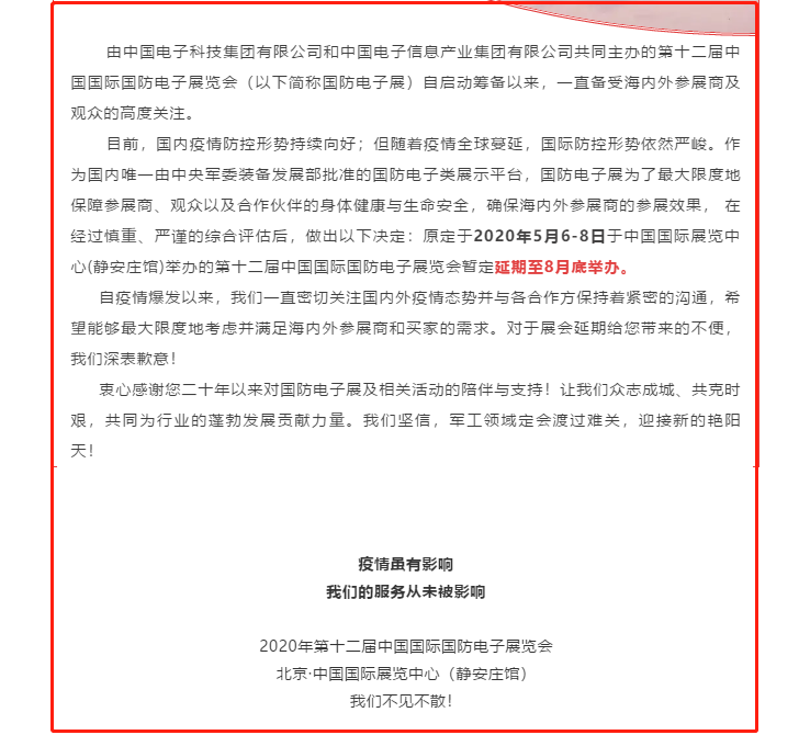 根據(jù)國防電子展設(shè)計搭建公司領(lǐng)藝展覽了解到,受新冠肺炎疫情影響,原定于2020年5月6-8日于中國國際展覽中心(靜安莊館)舉辦的第十二屆中國國際國防電子展覽會暫定延期至8月底舉辦。如需國防電子展設(shè)計請聯(lián)系領(lǐng)藝展覽,希望我們能在國防電子展搭建上為您添磚加瓦,祝各位朋友收獲多多,滿載而歸!