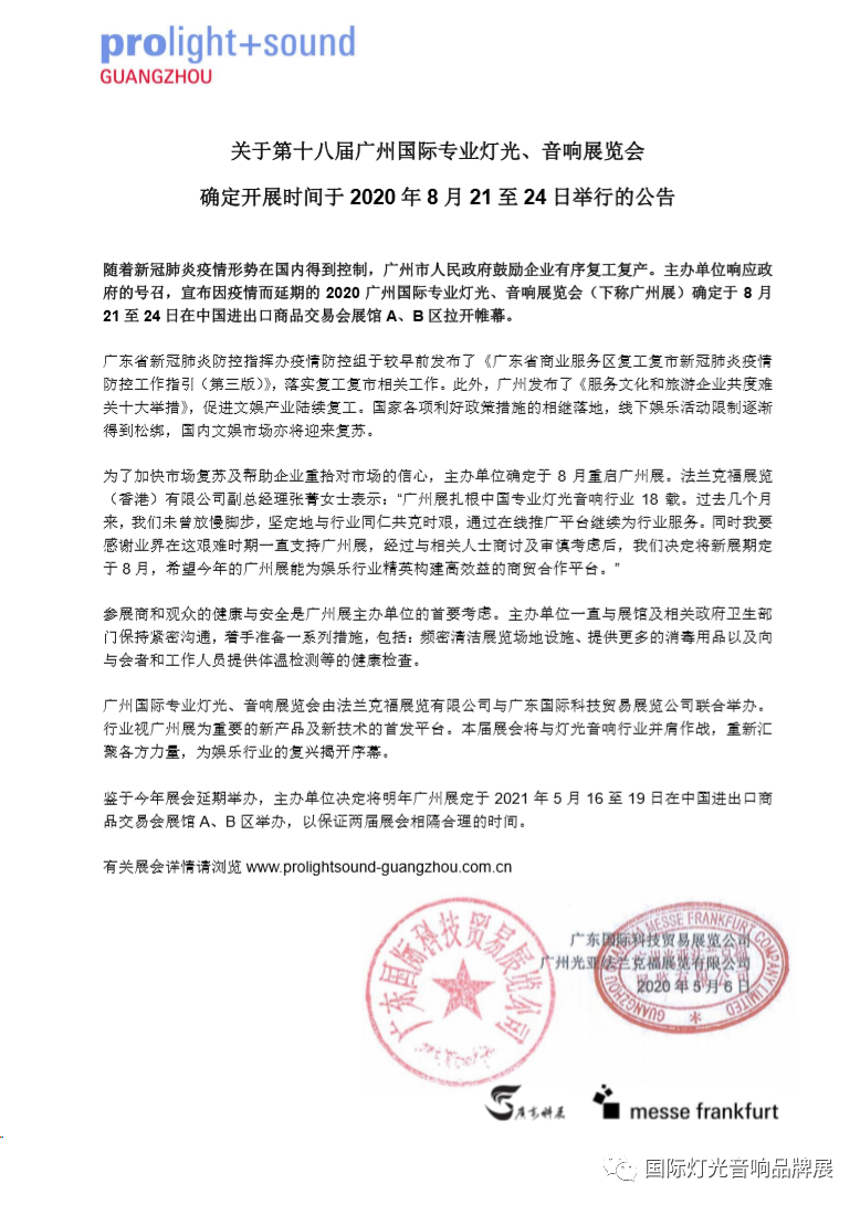 廣州燈光音響展設(shè)計(jì)搭建公司領(lǐng)藝展覽了解到,隨著新冠肺炎疫情形勢(shì)在國內(nèi)得到控制,廣州市人民政府鼓勵(lì)企業(yè)有序復(fù)工復(fù)產(chǎn)。主辦單位響應(yīng)政府的號(hào)召,宣布因疫情而延期的2020廣州國際專業(yè)燈光、音響展覽會(huì)(下稱廣州展)確定于8月21至24日在中國進(jìn)出口商品交易會(huì)展館A、B區(qū)拉開帷幕。如需廣州燈光音響展設(shè)計(jì)請(qǐng)聯(lián)系領(lǐng)藝展覽,希望我們能在廣州燈光音響展搭建上為您添磚加瓦,祝各位朋友收獲多多,滿載而歸!