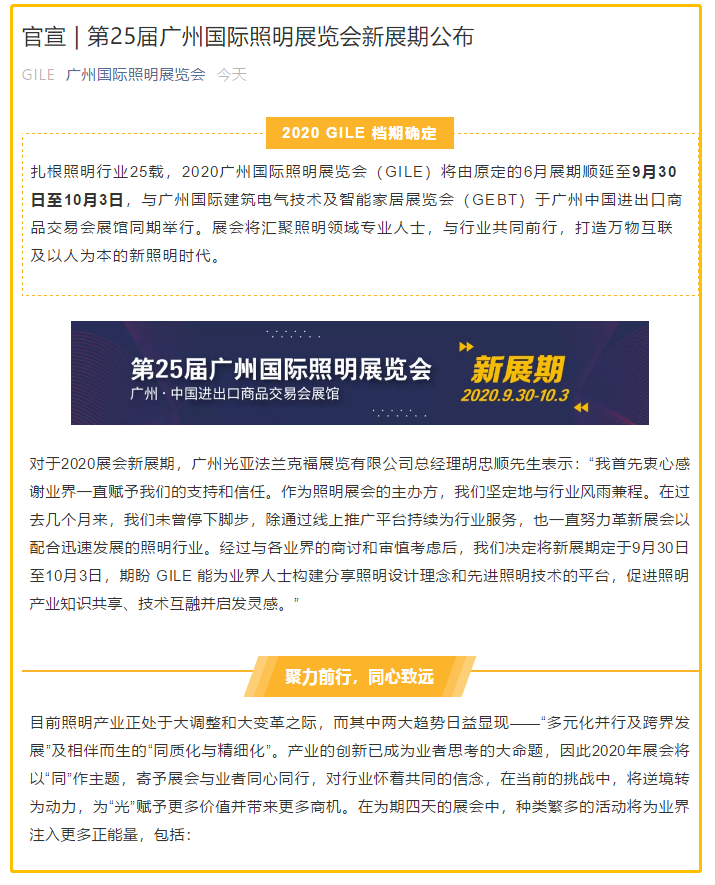 廣州照明展設(shè)計搭建公司領(lǐng)藝展覽了解到,扎根照明行業(yè)25載,2020廣州國際照明展覽會(GILE)將由原定的6月展期順延至9月30日至10月3日,與廣州國際建筑電氣技術(shù)及智能家居展覽會(GEBT)于廣州中國進出口商品交易會展館同期舉行。展會將匯聚照明領(lǐng)域?qū)I(yè)人士,與行業(yè)共同前行,打造萬物互聯(lián)及以人為本的新照明時代。如需照明展設(shè)計請聯(lián)系領(lǐng)藝展覽,希望我們能在照明展搭建上為您添磚加瓦,祝各位朋友收獲多多,滿載而歸!