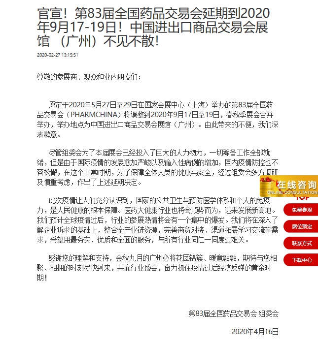 廣州藥交會設(shè)計搭建公司領(lǐng)藝展覽了解到,原定于2020年5月27日至29日在國家會展中心(上海)舉辦的第83屆全國藥品交易會(PHARMCHINA)將調(diào)整到2020年9月17日至19日,春秋季展會合并舉辦,舉辦地點為中國進出口商品交易會展館(廣州)。如需廣州藥交會設(shè)計請聯(lián)系領(lǐng)藝展覽,希望我們能在廣州藥交會搭建上為您添磚加瓦,祝各位朋友收獲多多,滿載而歸!