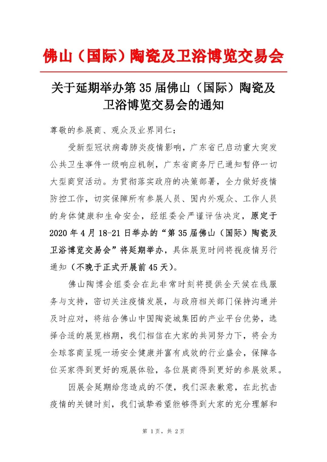 根據(jù)陶博會陶瓷展設(shè)計搭建公司領(lǐng)藝展覽了解到,受新型冠狀病毒疫情防控影響。為全力做好新型冠狀病毒感染肺炎疫情防控工作,為了響應(yīng)及配合疫情防控工作,確保各參展商及觀眾的健康安全,陶博會組委會決定將原定于2020年4月18-21日舉辦的第35屆佛山(國際)陶瓷及衛(wèi)浴博覽交易會將延期舉辦。有關(guān)展會的最新消息,請關(guān)注展會官網(wǎng):www.cerambath.org。如需陶博會設(shè)計請聯(lián)系領(lǐng)藝展覽,希望我們能在陶博會搭建上為您添磚加瓦,祝各位朋友收獲多多,滿載而歸!