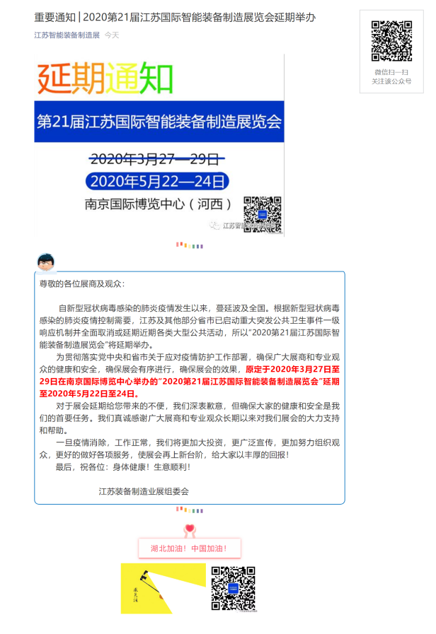 根據(jù)智能裝備展設(shè)計(jì)搭建公司領(lǐng)藝展覽解到,為貫徹落實(shí)黨中央和省市關(guān)于應(yīng)對(duì)疫情防護(hù)工作部署,確保廣大展商和專業(yè)觀眾的健康和安全,確保展會(huì)有序進(jìn)行,確保展會(huì)的效果,原定于2020年3月27日至29日在南京國(guó)際博覽中心舉辦的“2020第21屆江蘇國(guó)際智能裝備制造展覽會(huì)”延期至2020年5月22日至24日。如需智能裝備展設(shè)計(jì)請(qǐng)聯(lián)系領(lǐng)藝展覽,希望我們能在智能裝備展搭建上為您添磚加瓦,祝各位朋友收獲多多,滿載而歸!