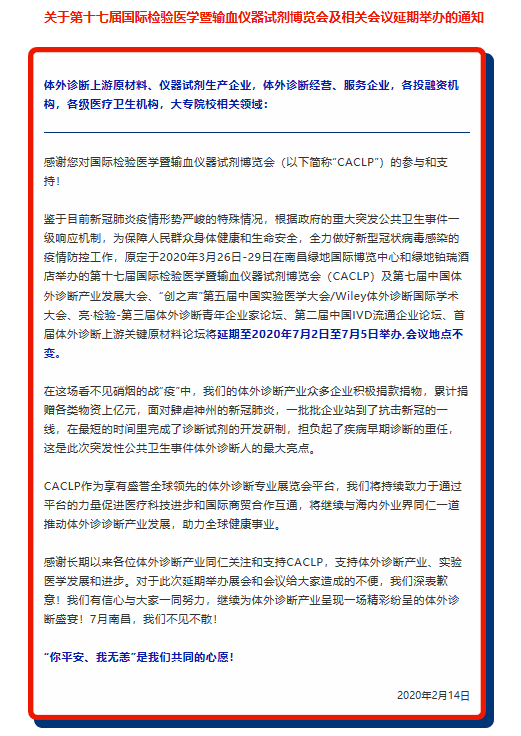 鑒于目前新冠肺炎疫情形勢(shì)嚴(yán)峻的特殊情況,根據(jù)政府的重大突發(fā)公共衛(wèi)生事件一級(jí)響應(yīng)機(jī)制,為保障人民群眾身體健康和生命安全,全力做好新型冠狀病毒感染的疫情防控工作,據(jù)上海檢驗(yàn)醫(yī)學(xué)展搭建商領(lǐng)藝展覽了解到原定于2020年3月26日-29日在南昌綠地國(guó)際博覽中心和綠地鉑瑞酒店舉辦的第十七屆國(guó)際檢驗(yàn)醫(yī)學(xué)暨輸血儀器試劑博覽會(huì)(CACLP)及第七屆中國(guó)體外診斷產(chǎn)業(yè)發(fā)展大會(huì)、“創(chuàng)之聲”第五屆中國(guó)實(shí)驗(yàn)醫(yī)學(xué)大會(huì)/Wiley體外診斷國(guó)際學(xué)術(shù)大會(huì)、亮·檢驗(yàn)-第三屆體外診斷青年企業(yè)家論壇、第二屆中國(guó)IVD流通企業(yè)論壇、首屆體外診斷上游關(guān)鍵原材料論壇將延期至2020年7月2日至7月5日舉辦,會(huì)議地點(diǎn)不變。領(lǐng)藝展覽為您上海檢驗(yàn)醫(yī)學(xué)展設(shè)計(jì)搭建保駕護(hù)航。