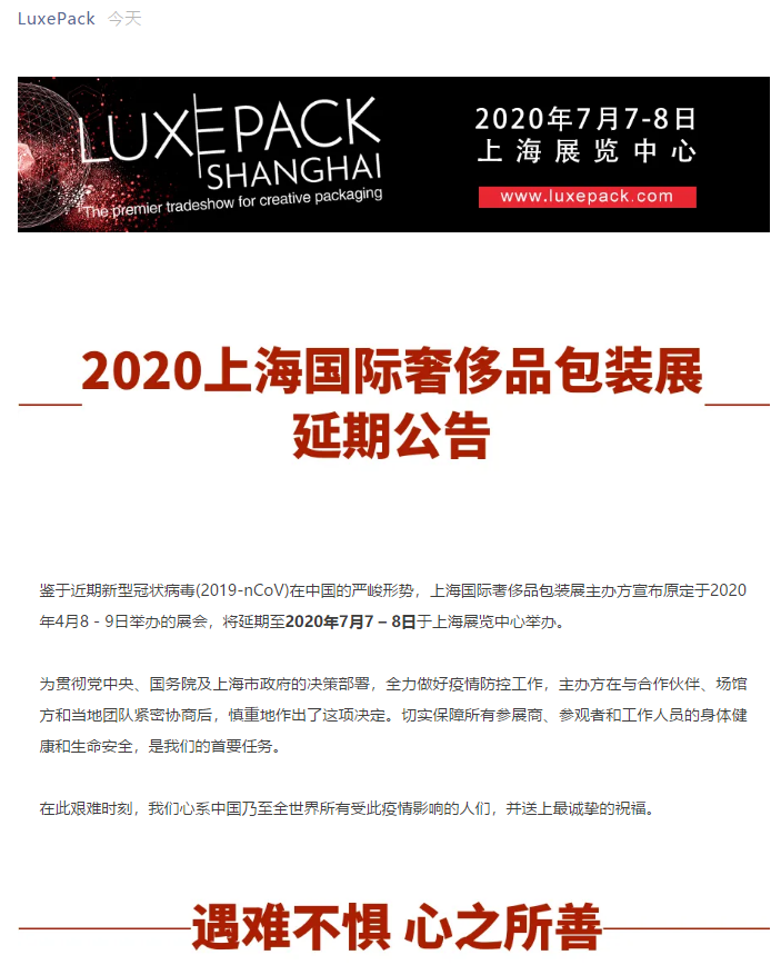 根據(jù)上海國際奢侈品包裝展設(shè)計搭建公司領(lǐng)藝展覽解到,鑒于近期新型冠狀病毒(2019-nCoV)在中國的嚴(yán)峻形勢,上海國際奢侈品包裝展主辦方宣布原定于2020年4月8 - 9日舉辦的展會,將延期至2020年7月7 – 8日于上海展覽中心舉辦。為貫徹黨中央、國務(wù)院及上海市政府的決策部署,全力做好疫情防控工作,主辦方在與合作伙伴、場館方和當(dāng)?shù)貓F隊緊密協(xié)商后,慎重地作出了這項決定。如需上海國際奢侈品包裝展設(shè)計請聯(lián)系領(lǐng)藝展覽,希望我們能在上海國際奢侈品包裝展搭建上為您添磚加瓦,祝各位朋友收獲多多,滿載而歸!