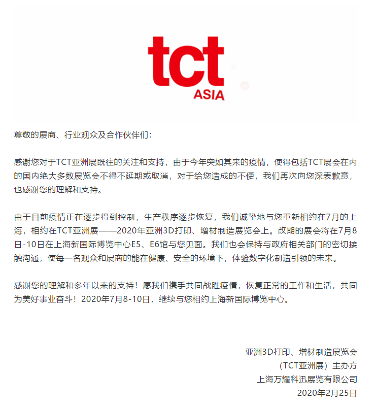 根據(jù)TCT亞洲展——2020年亞洲3D打印、增材制造展覽會(huì)設(shè)計(jì)搭建公司領(lǐng)藝展覽了解到,由于目前疫情正在逐步得到控制,生產(chǎn)秩序逐步恢復(fù),TCT亞洲展——2020年亞洲3D打印、增材制造展覽會(huì)將改期至7月8日-10日在上海新國(guó)際博覽中心E5、E6館與您見(jiàn)面。主辦方也會(huì)保持與政府相關(guān)部門(mén)的密切接觸溝通,使每一名觀眾和展商的能在健康、安全的環(huán)境下,體驗(yàn)數(shù)字化制造引領(lǐng)的未來(lái)。如需上海3D打印展設(shè)計(jì)請(qǐng)聯(lián)系領(lǐng)藝展覽,希望我們能在TCT亞洲展搭建上為您添磚加瓦,祝各位朋友收獲多多,滿載而歸!