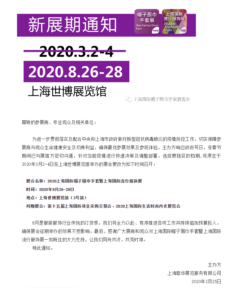 根據(jù)上海國際帽子圍巾手套服裝展設計搭建公司領藝展覽了解到,為進一步貫徹落實及配合中央和上海市政府做好新型冠狀病毒肺炎的疫情防控工作,切實保障參展商與觀眾生命健康安全及切身利益,確保最優(yōu)參展效果及參觀體驗,主辦方響應政府號召,在春節(jié)期間已與展館方密切溝通,針對當前疫情進行快速決策及調整部署,選擇更穩(wěn)妥的檔期,將原定于2020年3月2-4日在上海世博展覽館舉辦的展會更改2020年8月26-28日召開,如需服飾展設計請聯(lián)系領藝展覽,希望我們能在服裝展搭建上為您添磚加瓦,祝各位朋友收獲多多,滿載而歸!