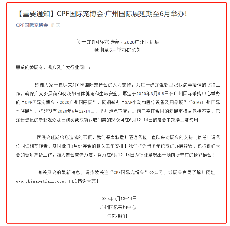 根據(jù)CPF寵博會(huì)設(shè)計(jì)搭建公司領(lǐng)藝展覽了解到,為進(jìn)一步加強(qiáng)新型冠狀病毒疫情的防控工作,確保廣大參展商和觀眾的身體健康和生命安全,原定于2020年3月6-8日在廣州國(guó)際采購(gòu)中心舉辦的“CPF國(guó)際寵博會(huì)·2020廣州國(guó)際展”,同期舉辦“SAF小動(dòng)物醫(yī)療設(shè)備及用品展”“GIAS廣州國(guó)際水族展”,將延期至2020年6月12-14日,舉辦地點(diǎn)不變。如需廣州寵博會(huì)設(shè)計(jì)請(qǐng)聯(lián)系領(lǐng)藝展覽,希望我們能在寵物展搭建上為您添磚加瓦,祝各位朋友收獲多多,滿載而歸!