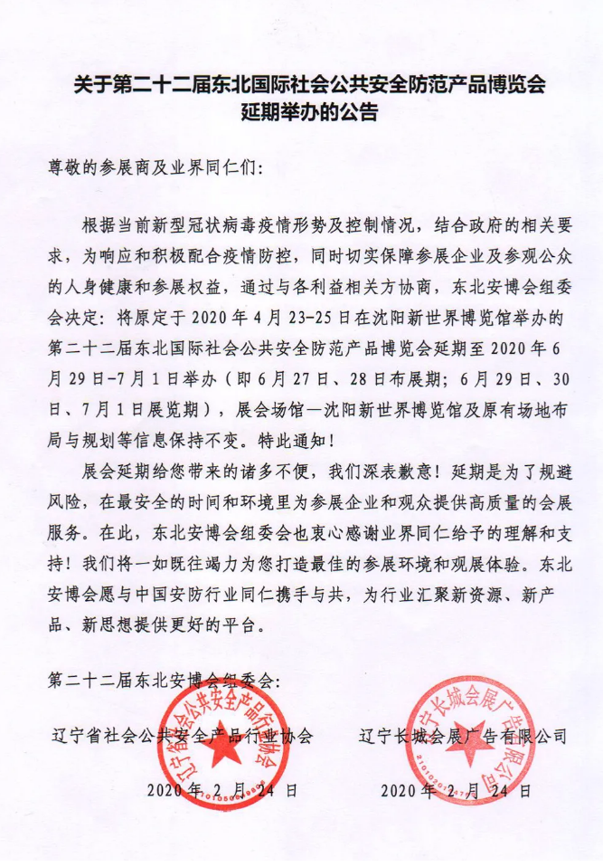 根據(jù)安博會(huì)設(shè)計(jì)搭建公司領(lǐng)藝展覽了解到,根據(jù)當(dāng)前新型冠狀病毒疫情形勢(shì)及控制情況,結(jié)合政府的相關(guān)要求,為響應(yīng)和積極配合疫情防控,同時(shí)切實(shí)保障參展企業(yè)及參觀公眾的人身健康和參展權(quán)益,通過(guò)與各利益相關(guān)方協(xié)商,東北安博會(huì)組委會(huì)決定:將原定于2020年4月23-25日在沈陽(yáng)新世界博覽館舉辦的第二十二屆東北國(guó)際社會(huì)公共安全防范產(chǎn)品博覽會(huì)延期至2020年6月29日-7月1日舉辦(即6月27日、28日布展期;6月29日、30日、7月1日展覽期),展會(huì)場(chǎng)館—沈陽(yáng)新世界博覽館及原有場(chǎng)地布局與規(guī)劃等信息保持不變。特此通知!