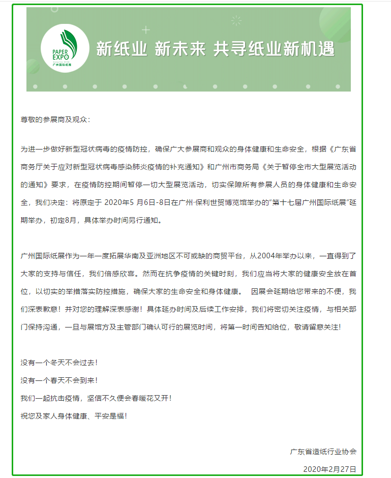 根據(jù)紙展設(shè)計搭建公司領(lǐng)藝展覽了解到,為進(jìn)一步做好新型冠狀病毒的疫情防控,確保廣大參展商和觀眾的身體健康和生命安全,根據(jù)《廣東省商務(wù)廳關(guān)于應(yīng)對新型冠狀病毒感染肺炎疫情的補(bǔ)充通知》和廣州市商務(wù)局《關(guān)于暫停全市大型展覽活動的通知》要求,在疫情防控期間暫停一切大型展覽活動,切實(shí)保障所有參展人員的身體健康和生命安全,主辦決定:將原定于2020年5月6日-8日在廣州·保利世貿(mào)博覽館舉辦的“第十七屆廣州國際紙展”延期舉辦,初定8月,具體舉辦時間另行通知。如需紙展設(shè)計請聯(lián)系領(lǐng)藝展覽,希望我們能在紙展搭建上為您添磚加瓦,祝各位朋友收獲多多,滿載而歸!