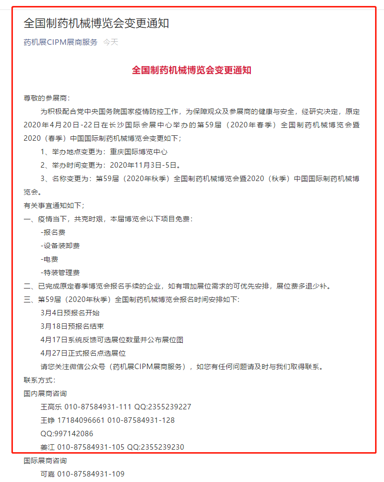 根據(jù)藥機(jī)展設(shè)計搭建公司領(lǐng)藝展覽了解到,為積極配合黨中央國務(wù)院國家疫情防控工作,為保障觀眾及參展商的健康與安全,經(jīng)研究決定,原定2020年4月20日-22日在長沙國際會展中心舉辦的第59屆(2020年春季)全國制藥機(jī)械博覽會暨2020(春季)中國國際制藥機(jī)械博覽會變更。如需藥機(jī)展設(shè)計請聯(lián)系領(lǐng)藝展覽,希望我們能在藥機(jī)展搭建上為您添磚加瓦,祝各位朋友收獲多多,滿載而歸!