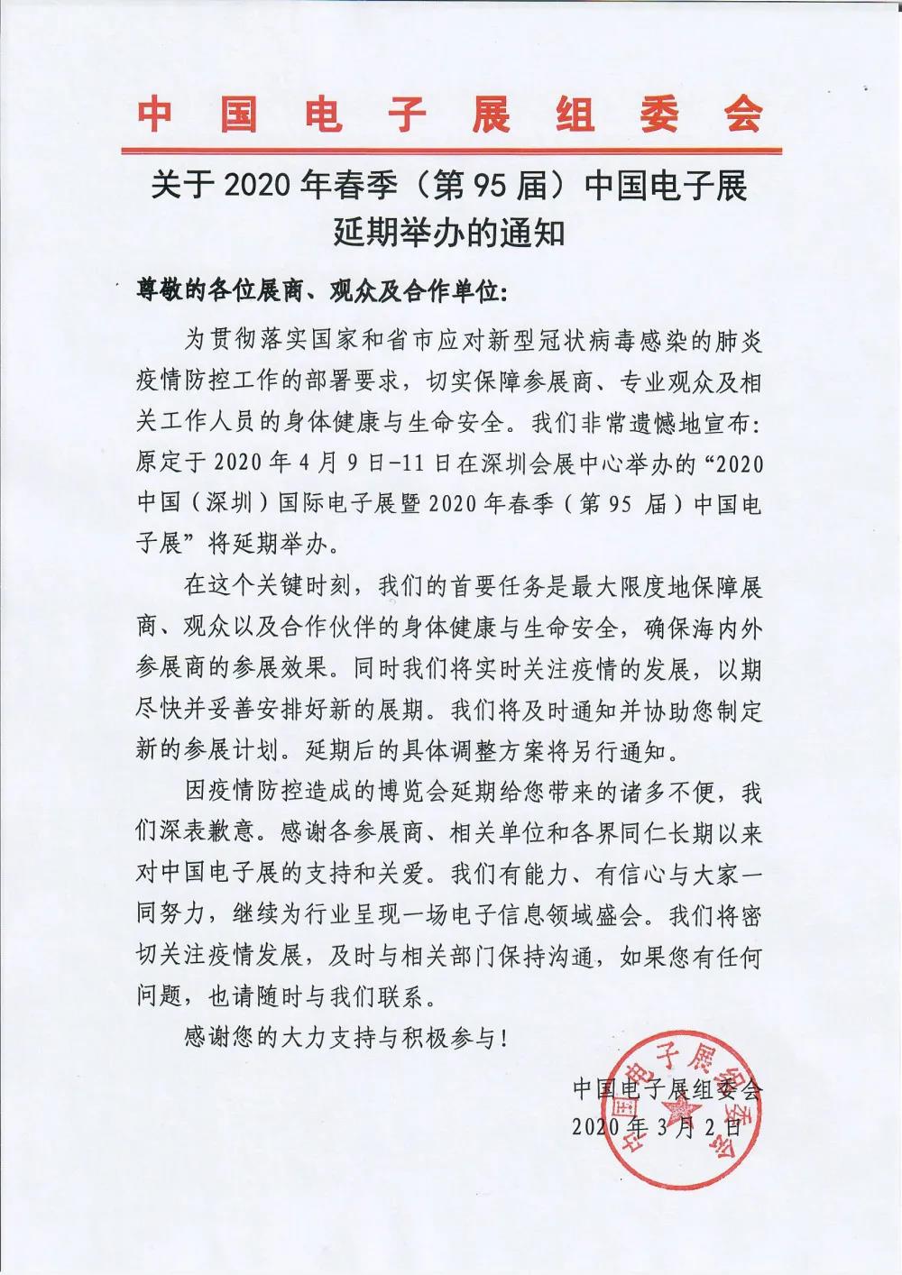 根據深圳電子展設計搭建公司領藝展覽了解到,原定于2020年4月9-11日在深圳會展中心舉辦的第95屆中國電子展延期,延期后的具體調整方案將另行通知。如需深圳電子展設計請聯系領藝展覽,希望我們能在深圳電子展搭建上為您添磚加瓦,祝各位朋友收獲多多,滿載而歸!