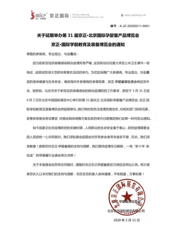 根據(jù)北京孕嬰童展設(shè)計搭建公司領(lǐng)藝展覽了解到,原定于2020年3月31日至4月2日在北京中國國際展覽中心舉辦的第31屆京正·北京國際孕嬰童產(chǎn)品博覽會將延期舉辦,具體展覽時間將視疫情另行通知。如需北京孕嬰童展展臺設(shè)計請聯(lián)系領(lǐng)藝展覽,希望我們能在北京孕嬰童展展臺搭建上為您添磚加瓦,祝各位朋友收獲多多,滿載而歸!