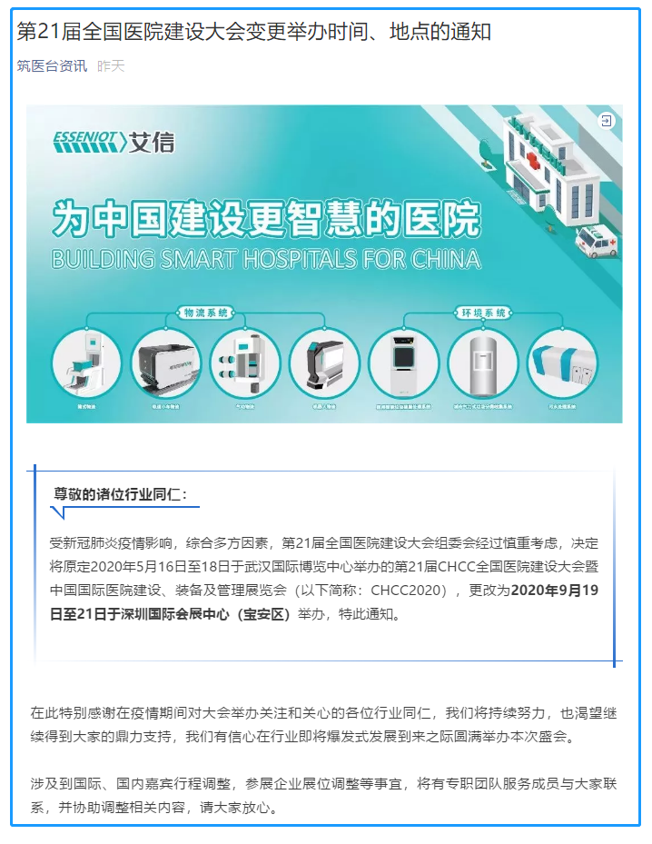 根據(jù)深圳展臺(tái)設(shè)計(jì)搭建公司領(lǐng)藝展覽了解到,受新冠肺炎疫情影響,綜合多方因素,第21屆全國(guó)醫(yī)院建設(shè)大會(huì)組委會(huì)經(jīng)過(guò)慎重考慮,決定將原定2020年5月16日至18日于武漢國(guó)際博覽中心舉辦的第21屆CHCC全國(guó)醫(yī)院建設(shè)大會(huì)暨中國(guó)國(guó)際醫(yī)院建設(shè)、裝備及管理展覽會(huì)(以下簡(jiǎn)稱(chēng):CHCC2020),更改為2020年9月19日至21日于深圳國(guó)際會(huì)展中心(寶安區(qū))舉辦,特此通知。如需深圳展臺(tái)設(shè)計(jì)請(qǐng)聯(lián)系領(lǐng)藝展覽,希望我們能在深圳展臺(tái)搭建上為您添磚加瓦,祝各位朋友收獲多多,滿載而歸!
