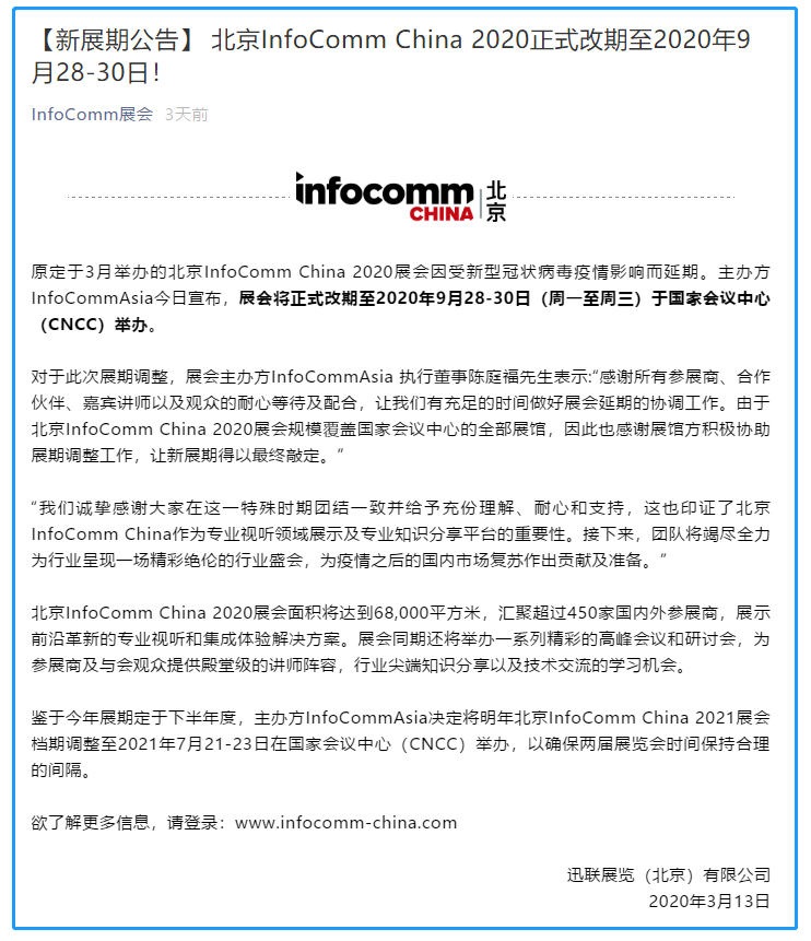 根據(jù)北京展會(huì)設(shè)計(jì)搭建公司領(lǐng)藝展覽了解到,原定于3月舉辦的北京InfoComm China 2020展會(huì)因受新型冠狀病毒疫情影響而延期。主辦方InfoCommAsia今日宣布,展會(huì)將正式改期至2020年9月28-30日(周一至周三)于國(guó)家會(huì)議中心(CNCC)舉辦。如需北京展會(huì)設(shè)計(jì)請(qǐng)聯(lián)系領(lǐng)藝展覽,希望我們能在北京展會(huì)搭建上為您添磚加瓦,祝各位朋友收獲多多,滿載而歸!