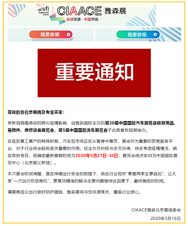 根據(jù)雅森汽配展設(shè)計搭建公司領(lǐng)藝展覽了解到,受新冠病毒感染的肺炎疫情影響,由雅森國際主辦的第30屆中國國際汽車服務(wù)連鎖暨用品、易損件、保修設(shè)備展覽會、第5屆中國國際洗車展覽會于此前宣布延期舉辦。在疫后復(fù)工復(fù)產(chǎn)的特殊時期,汽車后市場正在從暫停中復(fù)蘇,展會作為重要的貿(mào)易服務(wù)平臺,對于行業(yè)將會起到至關(guān)重要的作用。經(jīng)主辦方積極與多方協(xié)調(diào),綜合考慮疫情情況,響應(yīng)政府號召,現(xiàn)確定最新展期時間為2020年5月27日-30日,展覽會地點依舊為中國國際展覽中心(北京順義新館)。如需雅森展設(shè)計請聯(lián)系領(lǐng)藝展覽,希望我們能在雅森展搭建上為您添磚加瓦,祝各位朋友收獲多多,滿載而歸!