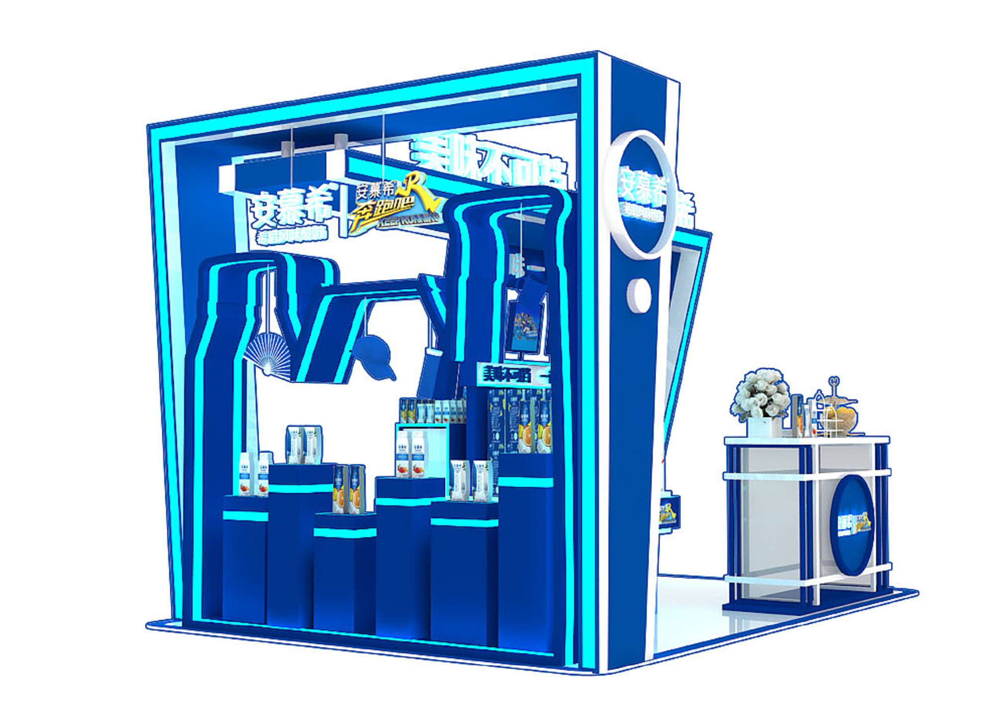 巧妙的運(yùn)用藍(lán)色作搭配,著重突出品牌和產(chǎn)品的展示,使整個(gè)展位時(shí)尚新穎巨有活力。